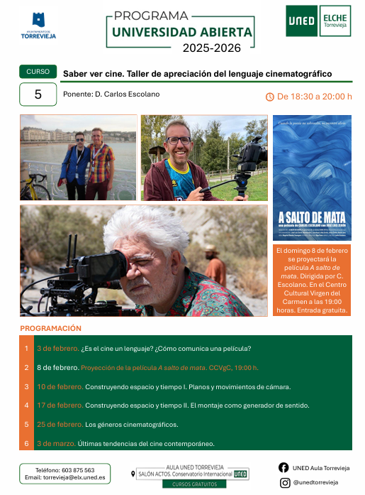 Tras el éxito del curso musical desarrollado durante el mes de enero, la Universidad Abierta de la UNED de Torrevieja cambia de registro y centra su programación de febrero en el cine y el lenguaje cinematográfico, con un curso específico que permitirá al alumnado sénior profundizar en las claves narrativas y expresivas del séptimo arte.