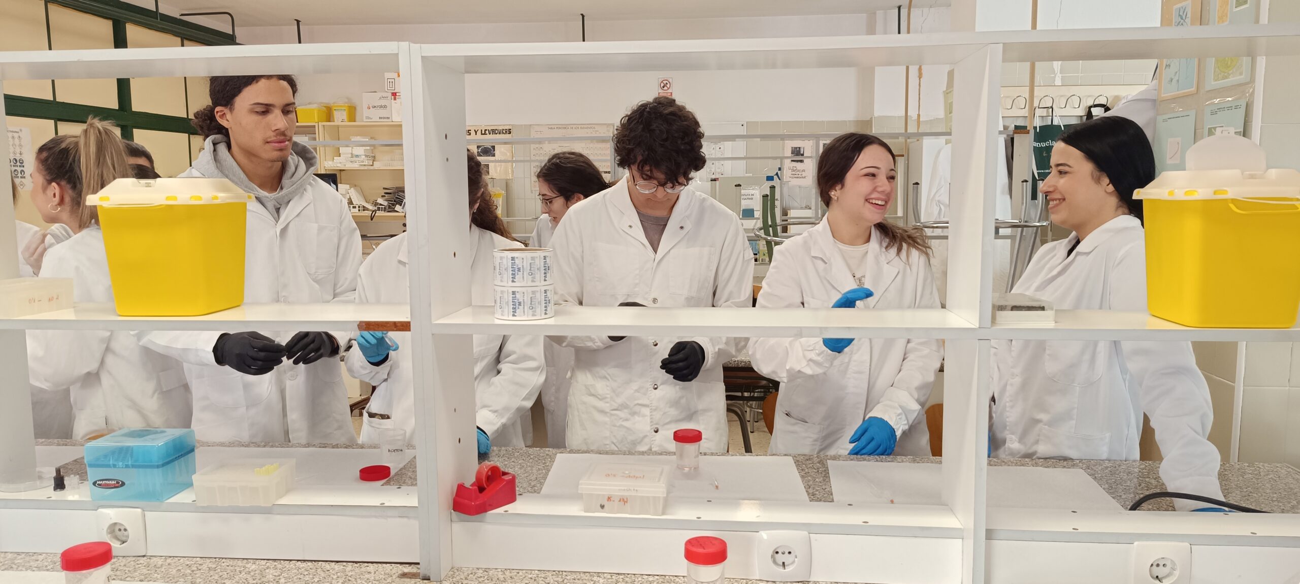 Durante la sesión, el alumnado del ciclo superior de Laboratorio Clínico y Biomédico aprendió a cultivar microorganismos en placa y en medio líquido, así como a extraer sus pigmentos y ADN, trabajando con muestras procedentes de las salinas locales.