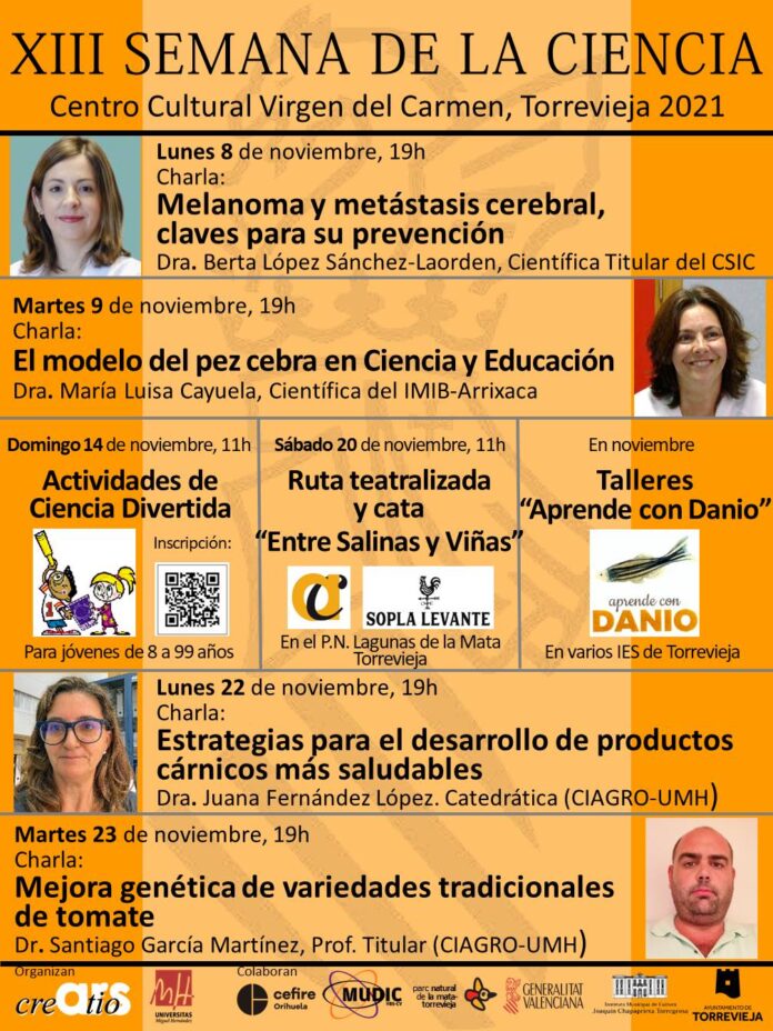 -Martes 9 de noviembre: “El modelo del pez cebra en ciencia y educación”, por María Luisa Cayuela, científica del Instituto Murciano de Investigación Biomédica (IMIB).