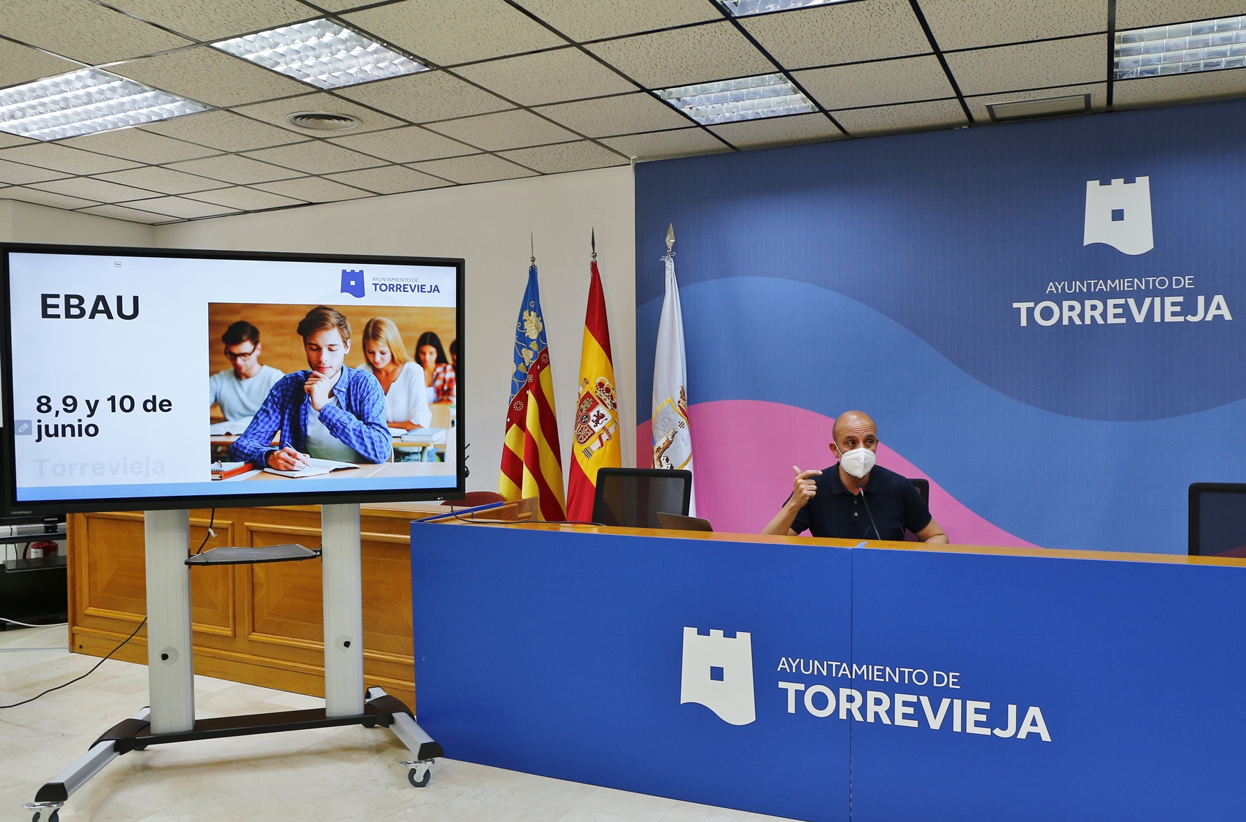 TORREVIEJA (03-06-2021). El concejal de Educación, Ricardo Recuero, ha presentado en la mañana de hoy el dispositivo preparado para la celebración de la Evaluación del Bachillerato para el Acceso a la Universidad (EBAU), que se realizarán por primera vez en el Auditorio Internacional de la ciudad de Torrevieja, durante los días 8, 9 y 10 de junio.