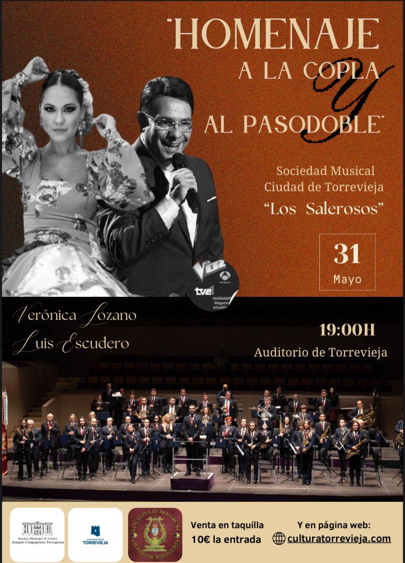 La Sociedad Musical «Ciudad de Torrevieja – Los Salerosos» ha organizado un nuevo concierto – espectáculo que tendrá lugar en el Auditorio Internacional de Torrevieja el próximo 31 de mayo. Será un emotivo concierto en honor a dos de los géneros más representativos de la música española: la copla y el pasodoble.