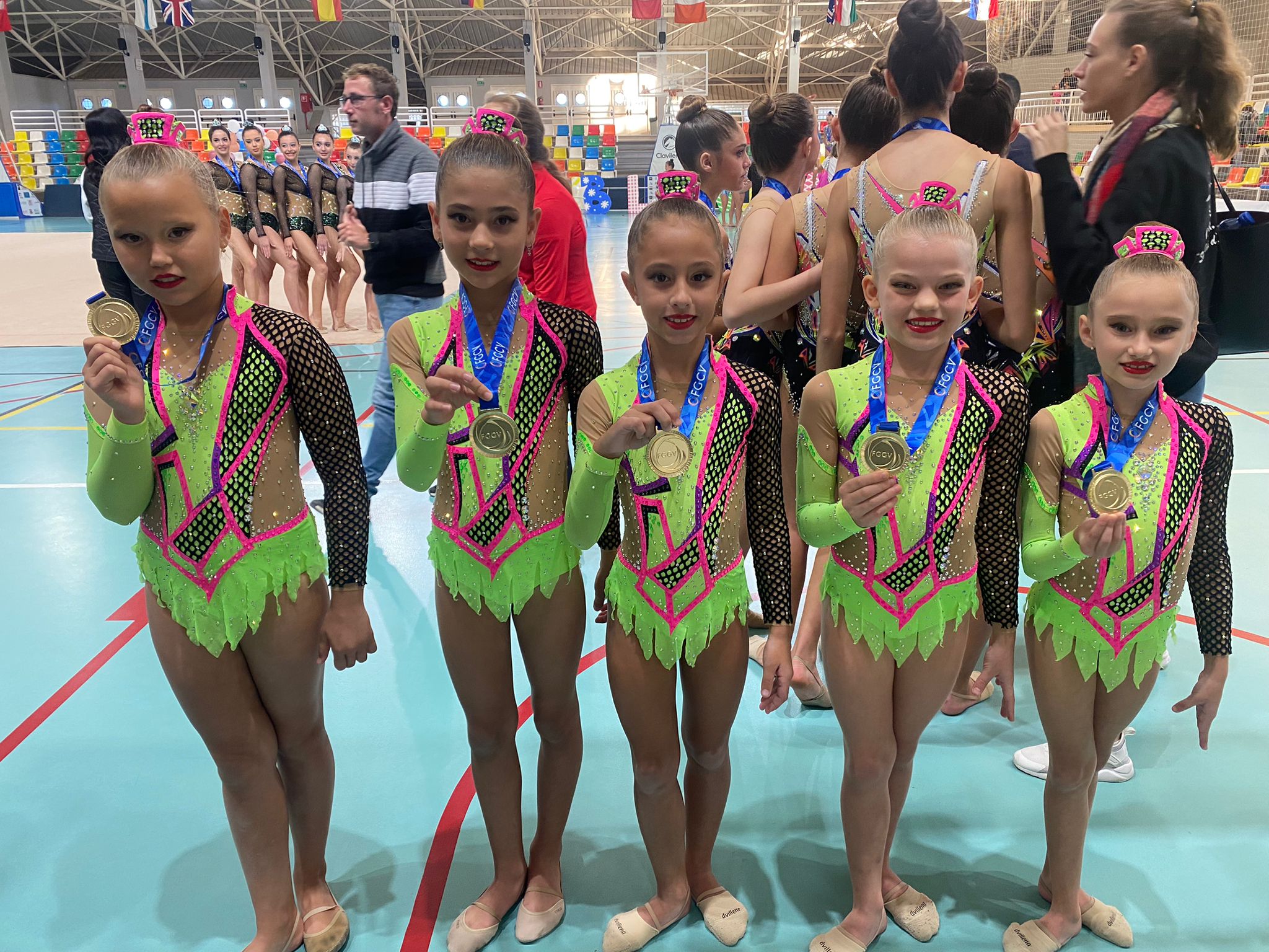 Modalidad conjuntos, categoría Benjamín nivel 1: Gala Martínez, Emilia Drapata, Alicia Estañ, Airis Serikbaeva y Alexandra Albu primeras clasificadas.