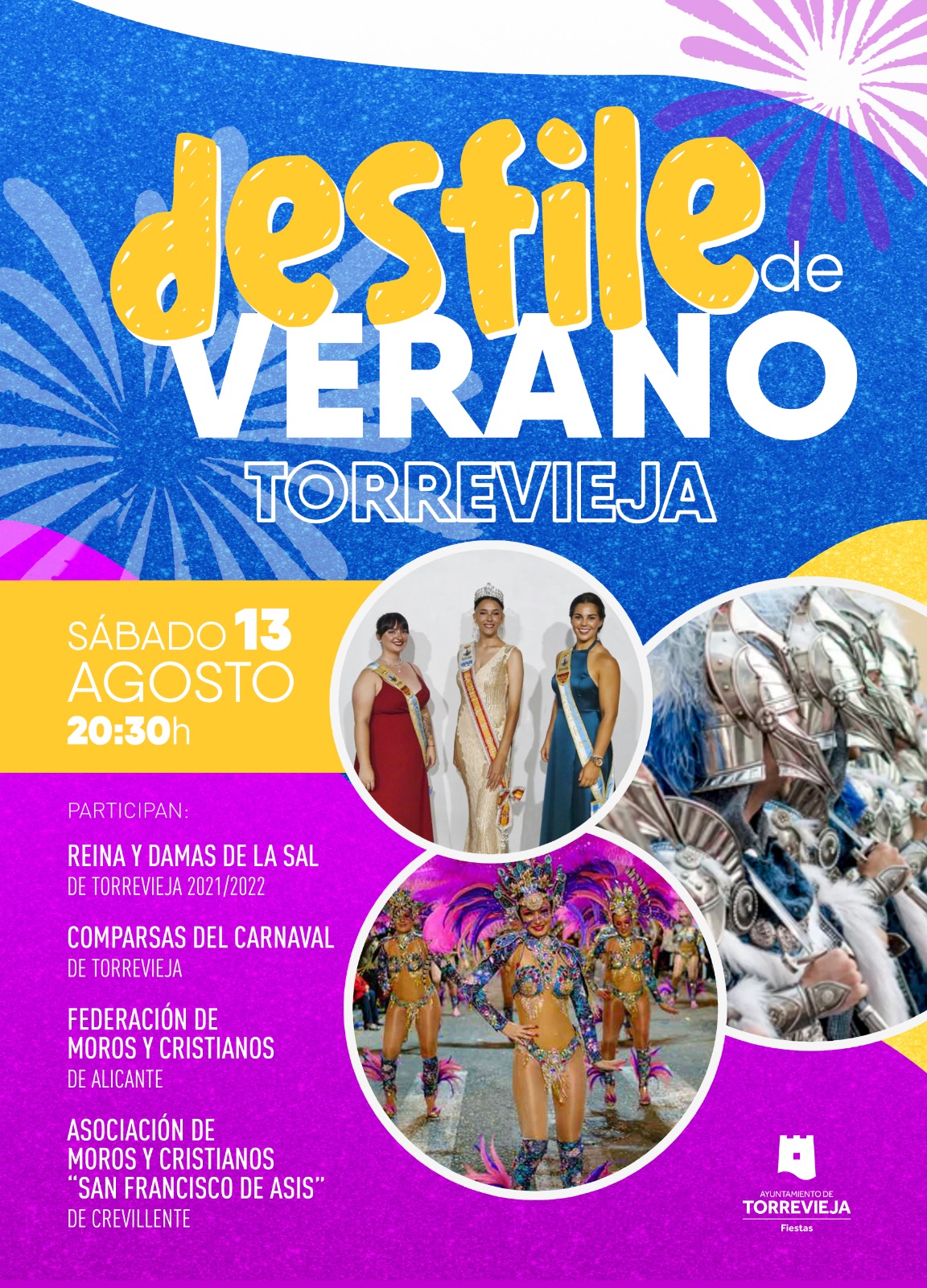 La principal protagonista del desfile será la corte salinera 2021/2022 que saludará a todos los asistentes desde una carroza. Luciendo todas sus galas estarán la Reina de la Sal, Victoria Magoñ Rodríguez y las damas, Juncal Gómez Rivero y Marta Mesa Vizcaíno. Estarán acompañadas por varias comparsas del Carnaval de Torrevieja, declarado de Interés Turístico Autonómico de la Comunitat Valenciana. Con todo el colorido y sus espectaculares coreografías desfilarán las comparsas, “No ni ná”, “Bufa la gamba”, “Blanca de sal…”, “Osadía”, “Aquí hay tomate”, “Las Cherries”, “Soul Dance” y “Soul Kids”. Junto a ellas estarán también las reinas mayor e infantil del carnaval, Brenda Hernández y Triana Marín.