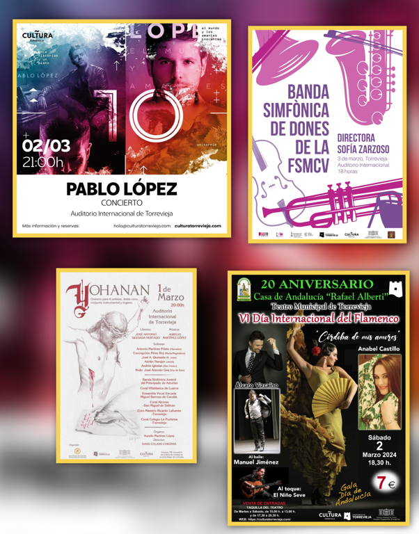 Tras un fin de semana con una variada actividad cultural, este próximo sábado el reconocido músico Pablo López hace una parada con su nueva gira en Torrevieja. Además, celebramos el Día Internacional del Flamenco de la mano de La Casa Andalucía “Rafael Alberti”, y tendremos dos conciertos de música clásica con la Banda Sinfónica de Mujeres de la FSMCV y el “Oratorio Yohanan”.