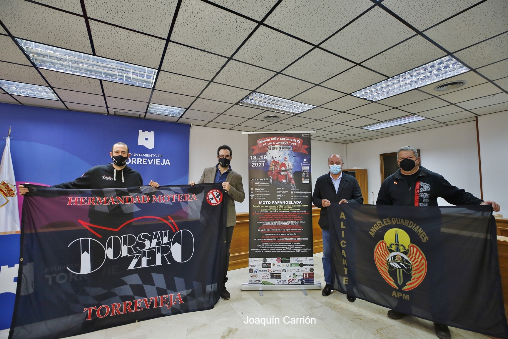 El concejal de Seguridad y Emergencias del Ayuntamiento de Torrevieja, Federico Alarcón, junto al concejal de Bienestar Social, Tomás Ballester, y los vicepresidentes de la APM Ángeles Guardianes (delegación de Alicante) y de la Hermandad Motera “Dorsal Zero”, Juan Antonio Rodríguez y Andrés Cebrián respectivamente, han presentado en la mañana de hoy la campaña “Ningún niñ@ sin juguete”, una Moto Papanoelada que tendrá lugar el próximo 18 de diciembre, a partir de las 18:30 horas.