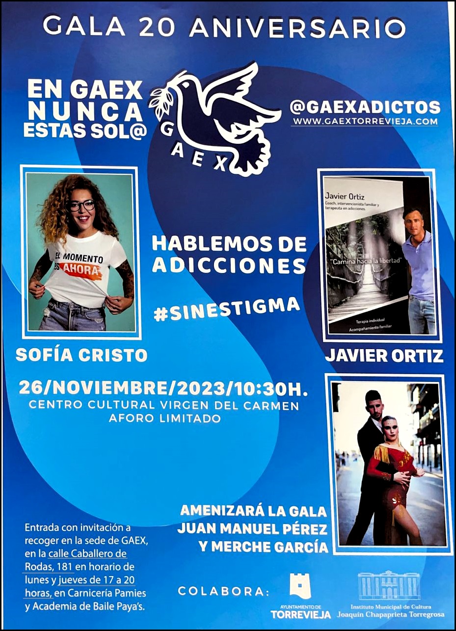Además el domingo 26 de Noviembre a las 10:30 horas, el Auditorio del Centro Cultural, se celebrará la» Gala 20 Aniversario de GAEX», que acogerá dos interesantes conferencias que correrán a cargo de la conocida Sofía Cristo, que tras su desintoxicación, se ha dedicado a trasmitir a los demás el peligro de las adiciones, siendo autora de varios libros sobre el tema, al igual de Javier Ortiz, que también ofrecerá una conferencia contando sus vivencias como adicto y exponiendo a los demás su método para alejarse de las diferentes adicciones.