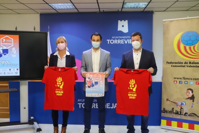 El alcalde de Torrevieja, Eduardo Dolón, junto a la concejal de Deportes, Diana Box y el gerente de la Federación Valenciana de Balonmano, Miguel Ángel Valero, presentaban en la mañana de ayer jueves la jornada de “Handbol al carrer” que se celebrará este domingo, 7 de noviembre, desde las 10:00 a las 14:00 horas en el Paseo Vista Alegre. Una actividad que forma parte de las acciones que se están desarrollando con motivo de la celebración en Torrevieja del XXV Mundial de Balonmano Femenino, el primero que se celebra en España.