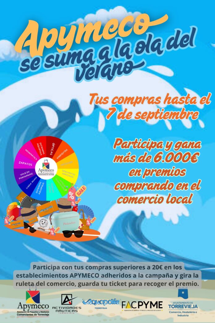 La concejal de Turismo, Comercio y Hostelería del Ayuntamiento de Torrevieja, Rosario Martínez, el presidente de la Asociación de Pequeños y Medianos Comerciantes (APYMECO), Jorge Almarcha, y el vicepresidente de APYMECO, Pedro García, han presentado la nueva campaña estival “APYMECO se suma a la ola del verano”. Hasta el 7 de septiembre, todas las compras superiores a 20€ en los establecimientos adheridos a la campaña podrán participar en la «Ruleta del Comercio», una acción promocional a través de un enlace en el teléfono móvil, que convierte cada ticket de compra en una oportunidad de ganar.