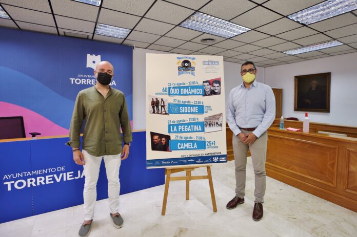 El concejal de Cultura del Ayuntamiento de Torrevieja, Antonio Quesada, junto al Gerente del Instituto Municipal de Cultura “Joaquín Chapaprieta”, Miguel Fernández, han presentado en la mañana de hoy el ciclo de conciertos que se celebrará en las Eras de la Sal los días 22, 27, 28 y 29 de agosto, y que lleva por nombre “Música & Sal”.