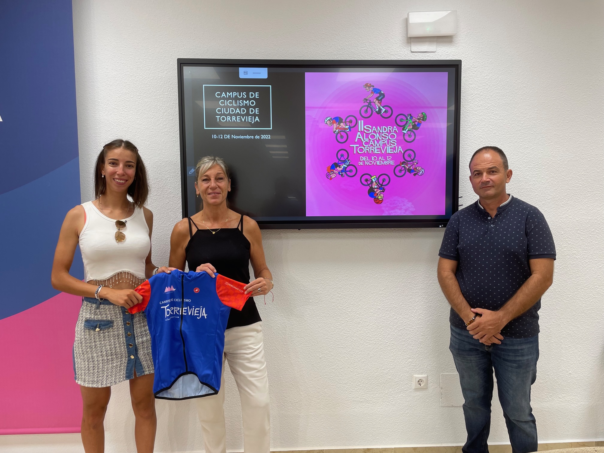 La concejal de Deportes del Ayuntamiento de Torrevieja, Diana Box, junto a la ciclista profesional Sandra Alonso, y el director del Campus, José Francisco Andreu, ha presentado en la mañana de hoy la segunda edición del “Sandra Alonso Campus Torrevieja”, que se celebrará del 10 al 12 de noviembre y que va destinado a niños y niñas de 8 a 14 años, con un límite de 25 plazas, pudiendo inscribirse a partir de hoy miércoles, 23 de agosto, y hasta el 1 de noviembre.