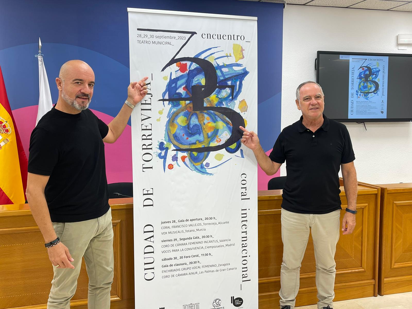 El concejal de Cultura, Antonio Quesada, y el presidente de la Coral Francisco Vallejos, José Miguel Ferrández, han presentado en la mañana de hoy el 35º Encuentro Coral Internacional “Ciudad de Torrevieja”, que se celebrará los días 28, 29 y 30 de septiembre en el Teatro Municipal.