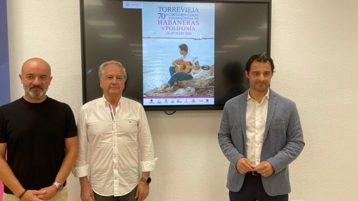 El alcalde de Torrevieja, Eduardo Dolón, junto con el concejal de Cultura, Antonio Quesada, ha presentado en la mañana de hoy el 70º Certamen Coral Internacional de Habaneras y Polifonía, que se celebrará del 21 al 27 de julio en el Teatro Municipal, el evento cultural más importante de Torrevieja, en el que se darán cita más de 800 coralistas venidos de países de Europa, América y Asia.