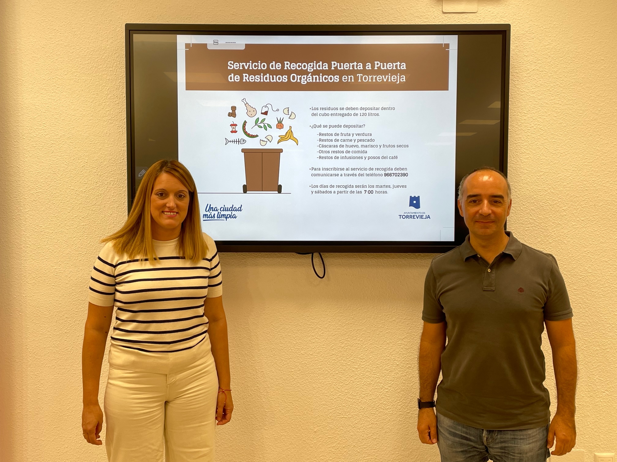 La concejal de Aseo Urbano del Ayuntamiento de Torrevieja, María José Ruiz, y el presidente de la Asociación de Empresas de Hostelería de Torrevieja y Comarca (AEHTC), José Ignacio Pastor, han presentado en rueda de prensa el nuevo servicio de recogida puerta a puerta de residuos orgánicos, así como el de reciclado de los residuos de envases de vidrio, que gestiona Ecovidrio, y que cuentan ambos con una subvención por parte de la Unión Europea (UE).