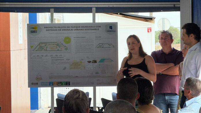 El alcalde de Torrevieja, Eduardo Dolón, junto con la concejal de Servicios Urbanos, Sandra Sánchez, la edil de Deportes, Diana Box, el gerente de AGAMED, Jorge Ballesta, y la gerente-adjunta de AGAMED, Gemma Cruz, han presentado ante los vecinos de la urbanización Aguas Nuevas el proyecto de construcción de un nuevo parque inundable multifuncional. Esta actuación, que forma parte del Plan Director de Pluviales del municipio, se desarrollará entre la Avenida de las Cortes Valencianas, Avenida de La Mancha y las calles Sancho Panza y Dulcinea.