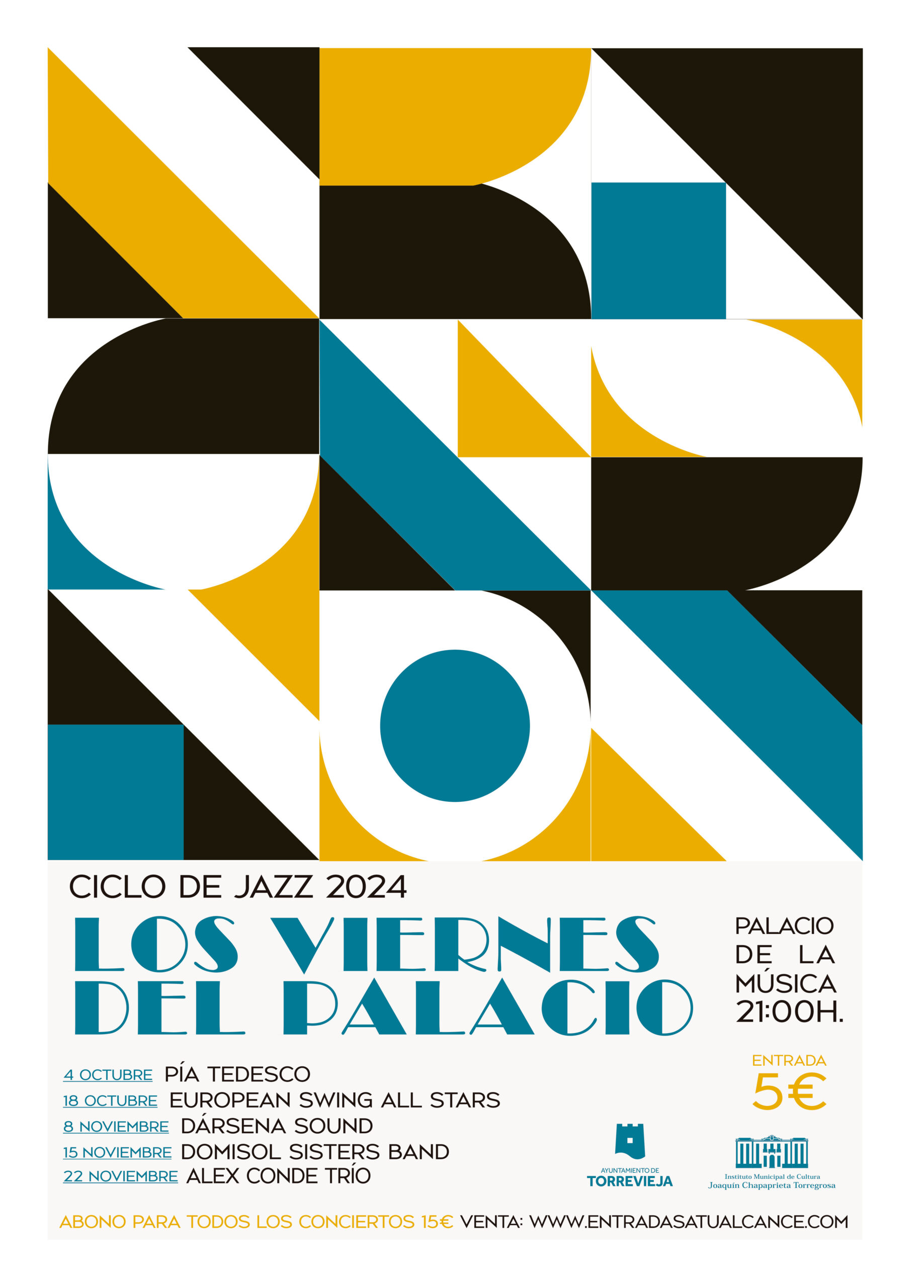 El Instituto Municipal de Cultura “Joaquín Chapaprieta” anuncia una nueva edición del ciclo de Jazz “Los Viernes del Palacio” que, como viene siendo tradicional, tendrá lugar en el Palacio de la Música a las 21:00 horas, los viernes 8 y 18 de octubre y 8, 15 y 22 de noviembre de 2024.