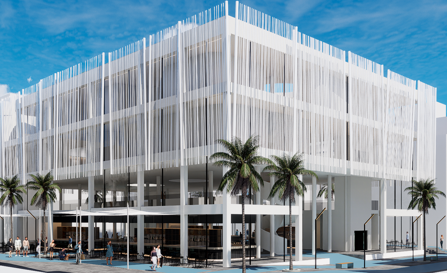 Otra de las premisas importantes de La Plasa es que el nuevo edificio tenga una clara integración con el entorno y, para ello, se ha optado por eliminar todos los cerramientos opacos de las fachadas, sustituyéndolo por una fachada totalmente acristalada. En el proyecto de ejecución se ha optado por añadir una piel exterior con lamas, de tal forma que la fachada queda más tupida, motivado por los cálculos de soleamiento y eficiencia térmica del edificio, variando la fisonomía que el edifico tenía a nivel del anteproyecto. Lo que se mantiene íntegramente es la eliminación parcial del forjado de la planta baja, quedando un atrio central a doble altura, rodeado por un altillo. Para dar luz adicional, que será la protagonista del edificio, se ha optado por abrir dos claraboyas hasta la planta baja.