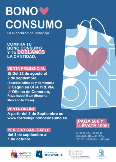 El sábado, 3 de septiembre, se abrirá la venta online (a través de la web https://torrevieja.bonoconsumo.es), a partir de este día se podrán canjear los bonos en los establecimientos adheridos a esta quinta campaña hasta el sábado 1 de octubre. En la pasada edición del Bono Consumo participaron un total de 339 establecimientos.