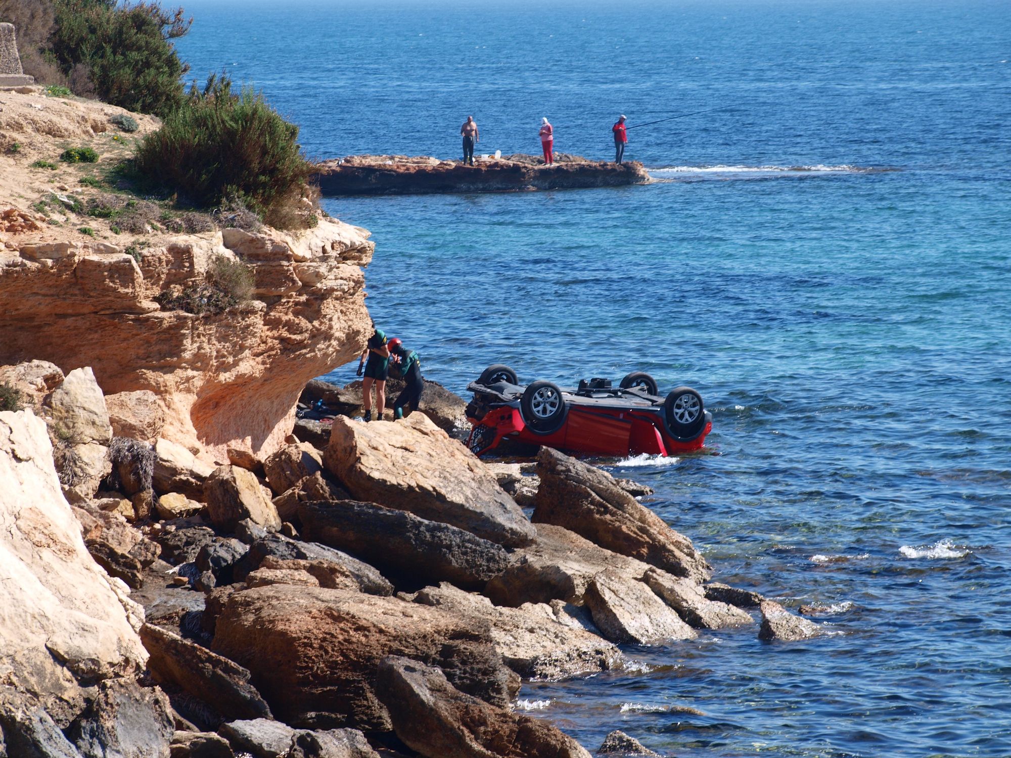 La Guardia Civil mantiene activa la investigación sobre la aparición de un vehículo precipitado en un acantilado de Orihuela Costa limítrofe con Torrevieja. Buzos de la del cuerpo buscan al conductor del coche accidentado.