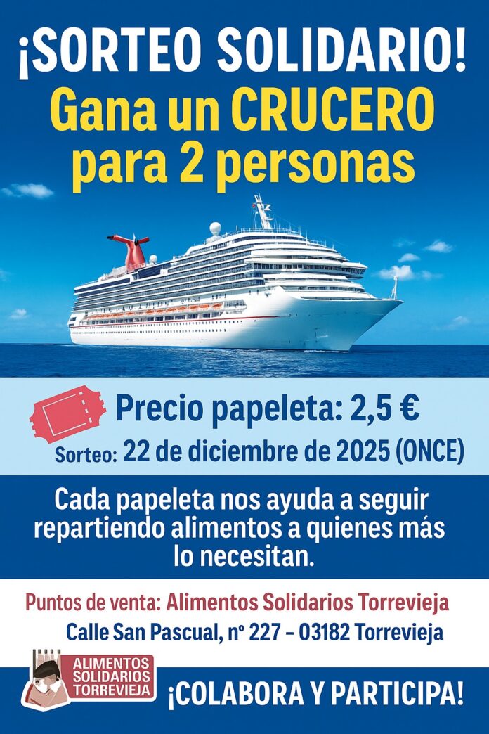 La ONG Alimentos Solidarios Torrevieja ha puesto en marcha una nueva iniciativa solidaria  para recaudar fondos que permitan mantener su labor diaria de reparto de alimentos a  personas y familias en situación vulnerable: un gran sorteo de un crucero, con el que  cualquier persona puede colaborar mientras opta a un viaje inolvidable.