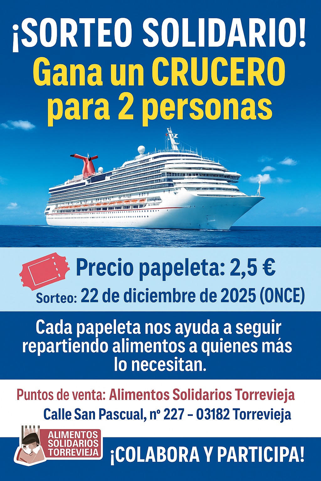 InicioActividadesAlimentos Solidarios Torrevieja lanza un gran Sorteo Solidario: un crucero  para seguir...