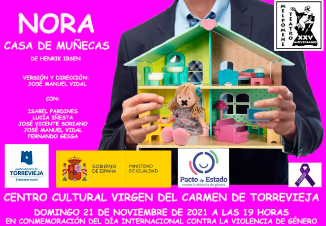 Este próximo domingo, 21 de noviembre, a las 19:00 horas, el Centro Cultural Virgen del Carmen, con motivo del Día Internacional contra la Violencia de Género (25 de noviembre), se representará la obra de teatro “Casa de muñecas”, de Henrik Ibsen, dirigido por José Manuel Vidal.