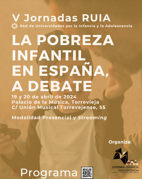 Paralelamente a la actividad estatutaria de la RUIA, la Cátedra de Infancia y Adolescencia de la Universitat Politècnica de València (UPV), junto con el Ayuntamiento Y el Aula de la UNED de Torrevieja, que anunció recientemente su inmediata adhesión a la Cátedra, organizan las V Jornadas RUIA, bajo el lema La pobreza infantil en España, a debate.