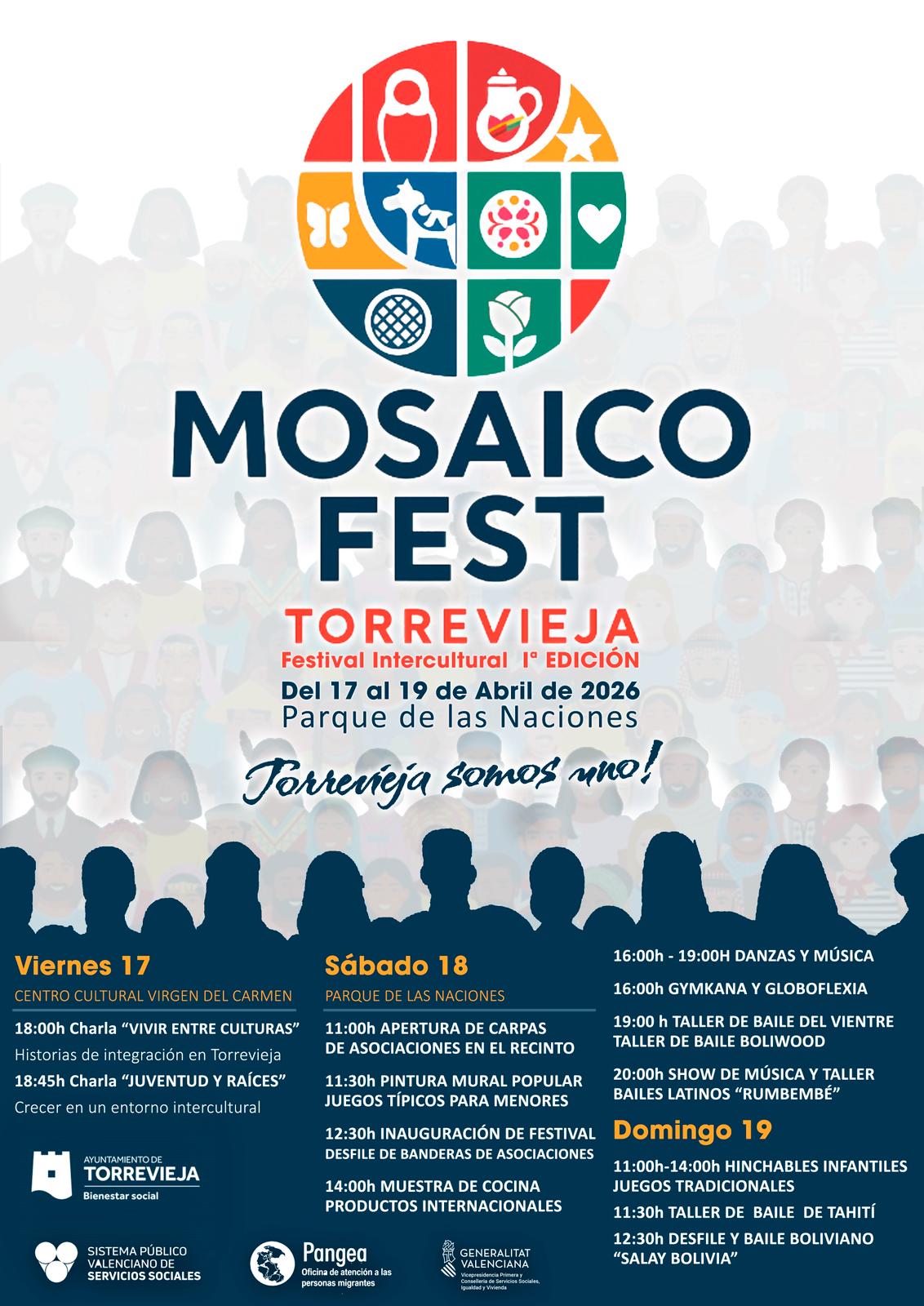 El Torrevieja acogerá del 17 al 19 de abril el I Mosaico Fest, un gran encuentro intercultural bajo el lema “Torrevieja somos uno”, con el objetivo de fomentar la convivencia, la participación ciudadana y la igualdad de trato.
