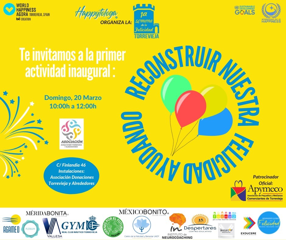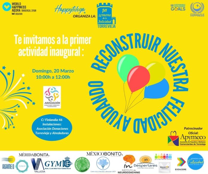 Desde este domingo 20 de marzo y hasta el sábado 26 de marzo se celebra en Torrevieja la Primera Semana de la Felicidad», organizada por «Happytóloga» y la Asociación «Donaciones Torrevieja y Alrededores», con el patrocinio oficial de la Asociación de Pequeños y Medianos Comerciantes de Torrevieja (APYMECO). El acto de inauguración y el de clausura serán presenciales, el primero el domingo 20 a las 10,00 horas, en la sede de la Asociación de la Calle Finlandia, 46 y el sábado 26 a las 20,00 horas, se clausurará la Semana, con el acto «Esparce felicidad Bailando» con Mónica García en las instalaciones del Real Club Náutico de Torrevieja.