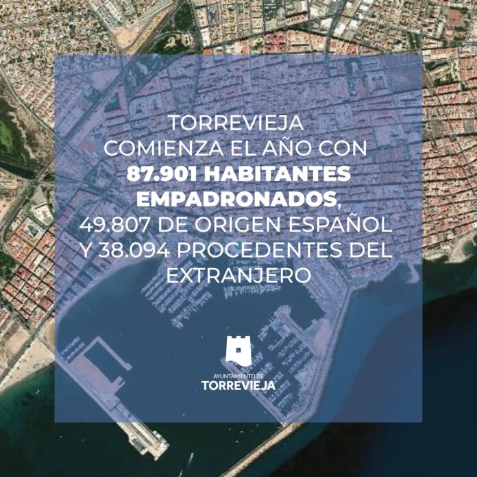 Según los datos estadísticos de población y evolución del Padrón Municipal del Ayuntamiento, la ciudad de Torrevieja ha comenzado el año 2022 con un total de 87.901 habitantes empadronados, de los cuales 49.807 (56´6%) son de origen español, mientras que el resto, 38.094 (43´4%) proceden del extranjero.