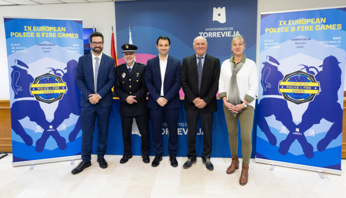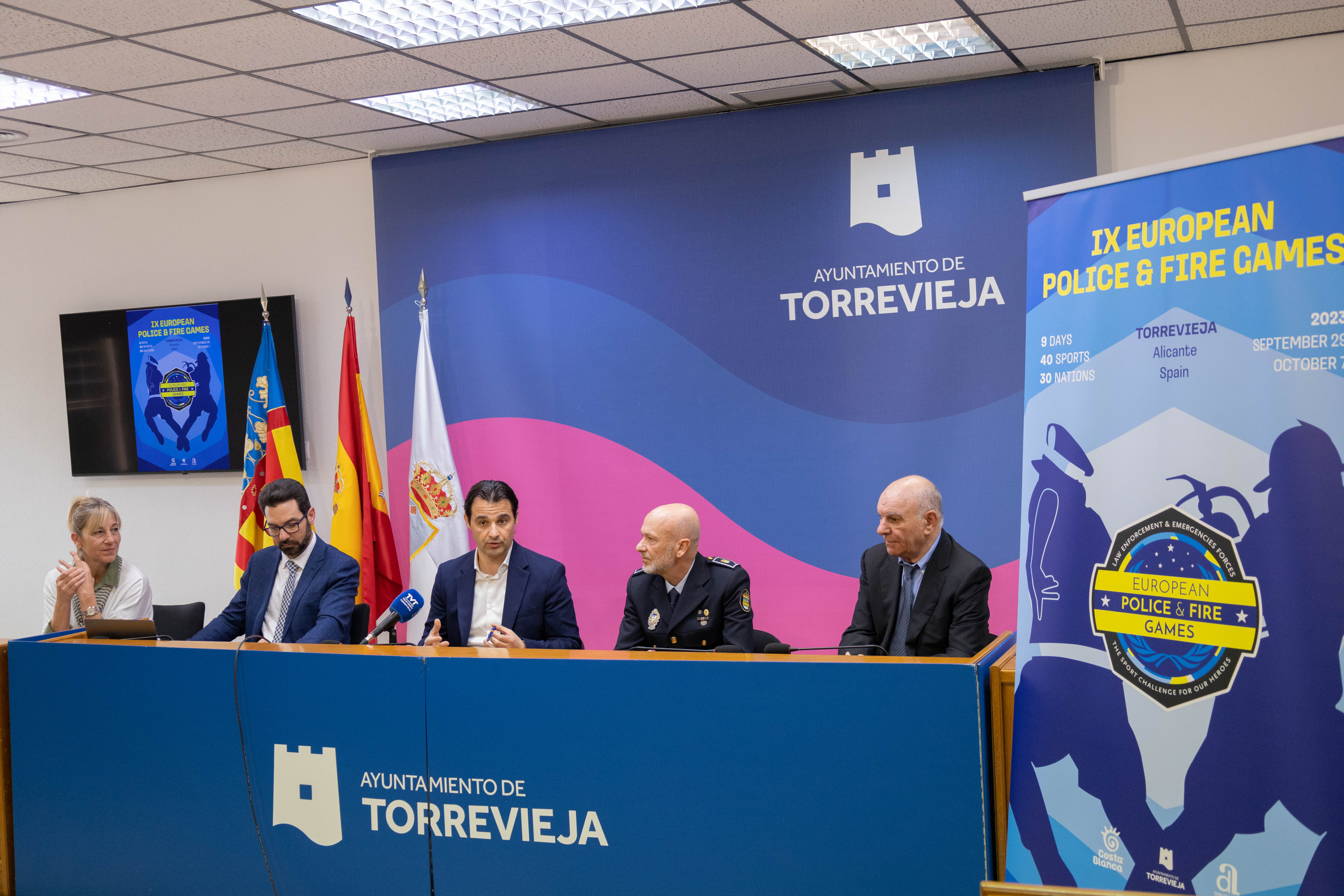 El Alcalde de Torrevieja, Eduardo Dolón, la concejal de Deportes, Diana Box, el edil de Seguridad y Emergencias, Federico Alarcón, el presidente de los Juegos, José Carlos Baquero, y su vicepresidente, Ricardo Tilve, han presentado en la mañana de hoy la novena edición de los European Police & Fire Games (Juegos Europeos de Policías y Bomberos), que se celebrarán en Torrevieja del 29 de septiembre al 7 de octubre de 2023.