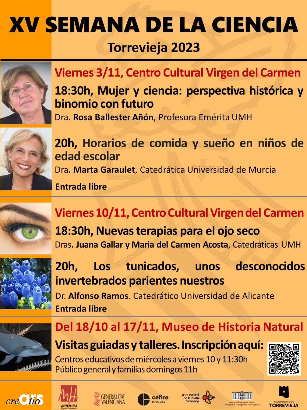 Cuatro charlas de divulgación científica, impartidas por profesoras e investigadoras seleccionadas de la Universidad Miguel Hernández, la Universidad de Alicante y la Universidad de Murcia, y visitas guiadas y talleres en el Museo de Historia Natural de Torrevieja conforman la programación abierta al público este año