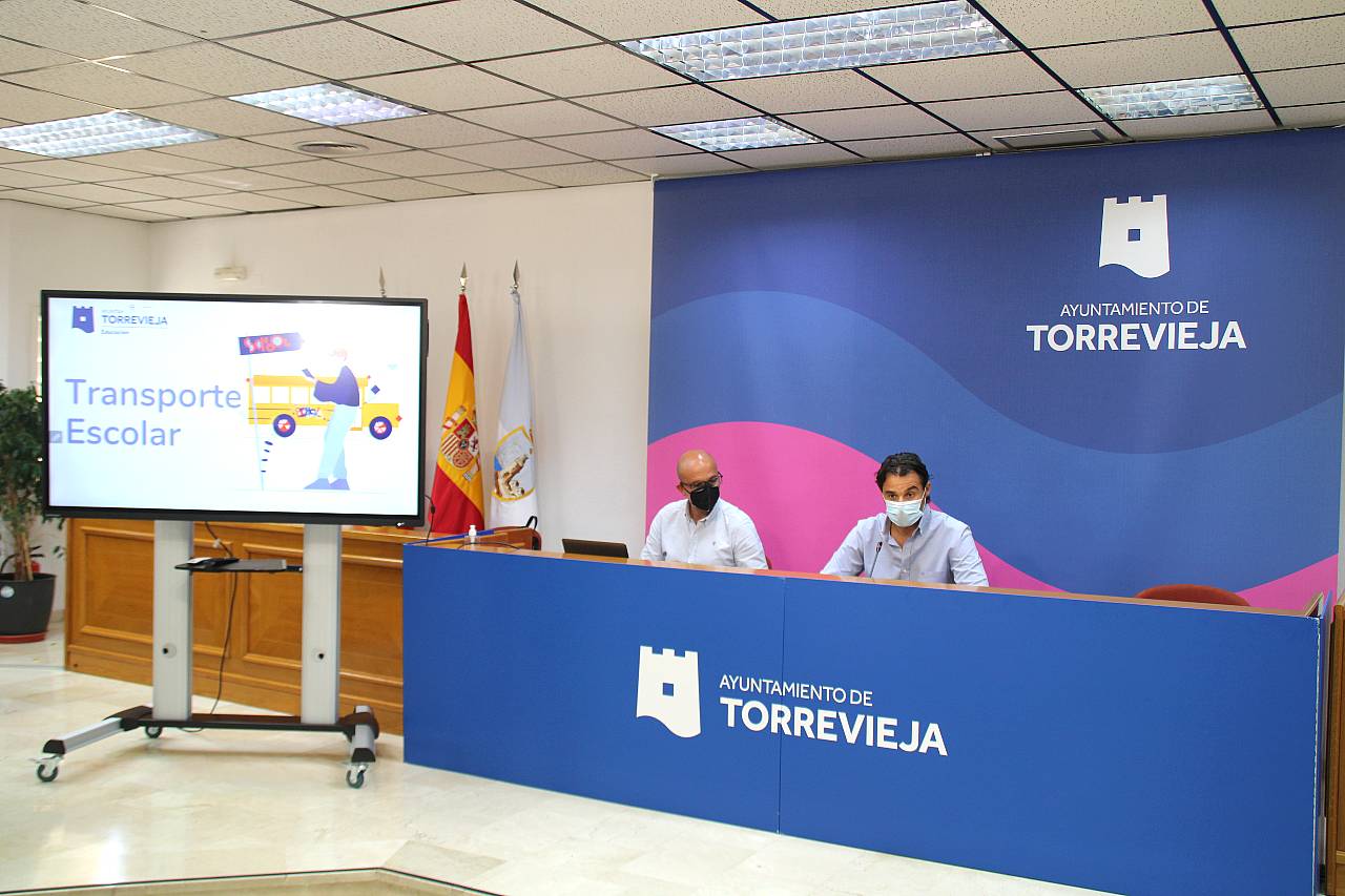 Torrevieja 27-08-21 El alcalde de Torrevieja, Eduardo Dolón, junto al concejal de Educación, Ricardo Recuero, han presentado en la mañana de hoy las ayudas al transporte escolar. Unas ayudas que se recuperan tras cinco años olvidadas por el anterior equipo de gobierno y que se ajustan a las necesidades de la comunidad escolar. El edil torrevejense se enorgullecía de retomar estas ayudas ya que estas son una de las primeras históricamente que el Partido Popular ha venido desarrollando en estos últimos años en Torrevieja.